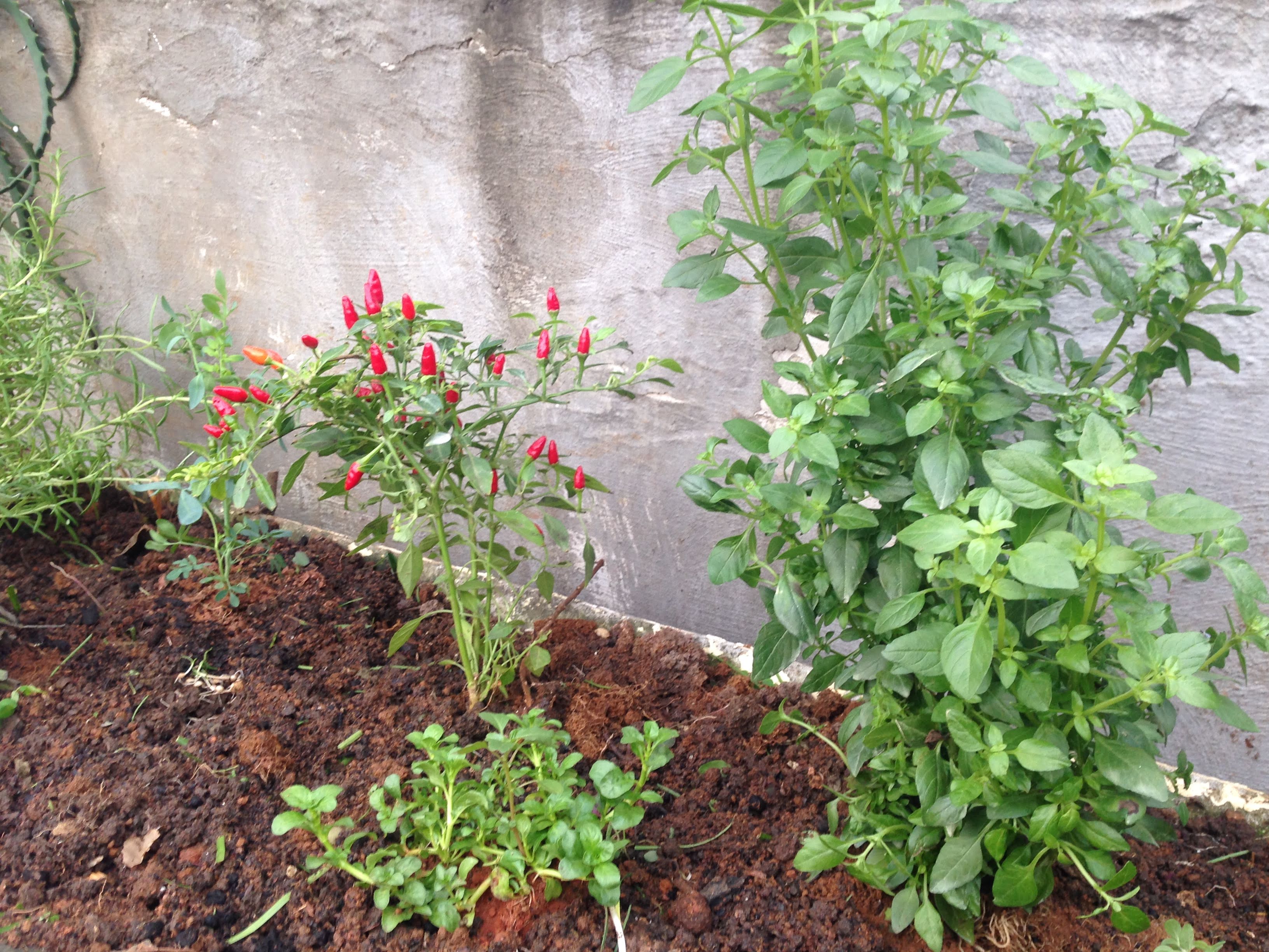 Na parte superior do bar, Lívia fez, junto com o pai, uma pequena horta onde cultivam temperos, ervas e até algumas verduras que são usadas na cozinha. Ela conta que o pai sempre gostou de mexer com a terra e como usava bastante manjericão pra fazer a Berinjela Margherita, eles resolveram plantar. E deu certo. Com o cuidado constante, eles conseguem fazer estacas e reproduzir as ervas para sempre ter temperos frescos à mão. A horta também tem alecrim, tomilho, hortelã, pimenta, couve e capim-santo, muito usado em uma das caipirinhas da casa. Em um vaso, há um pé de berinjela que, claro, não vai produzir os 180 quilos que eles usam do legume por semana, mas fica como um símbolo da história desse bar.