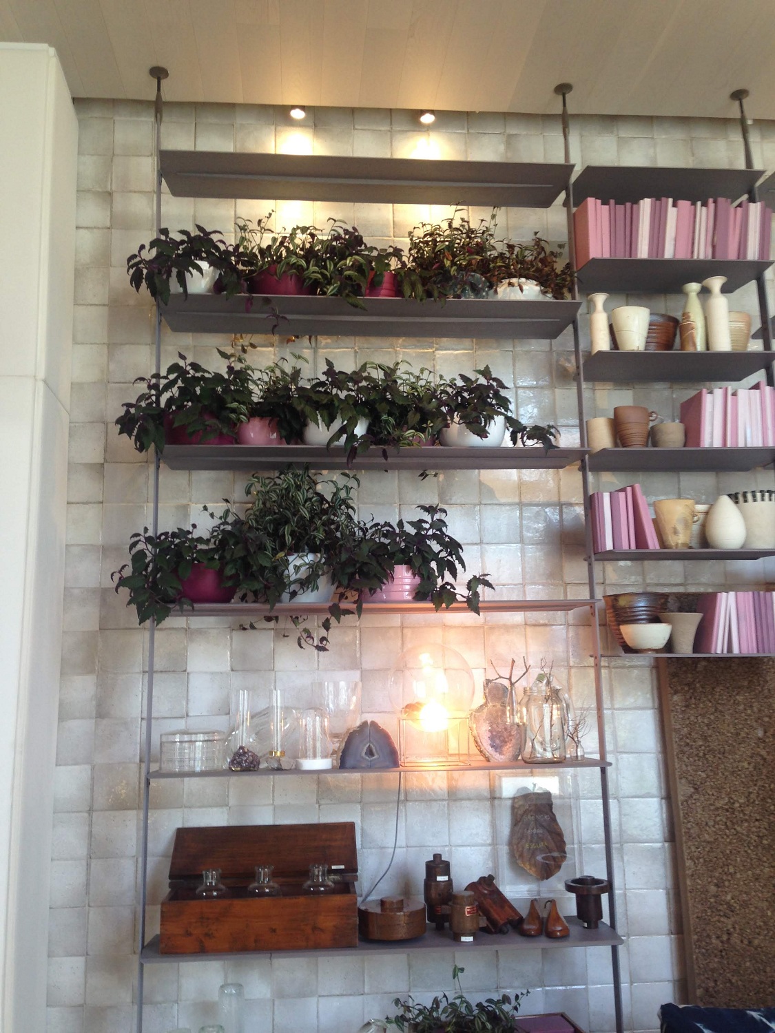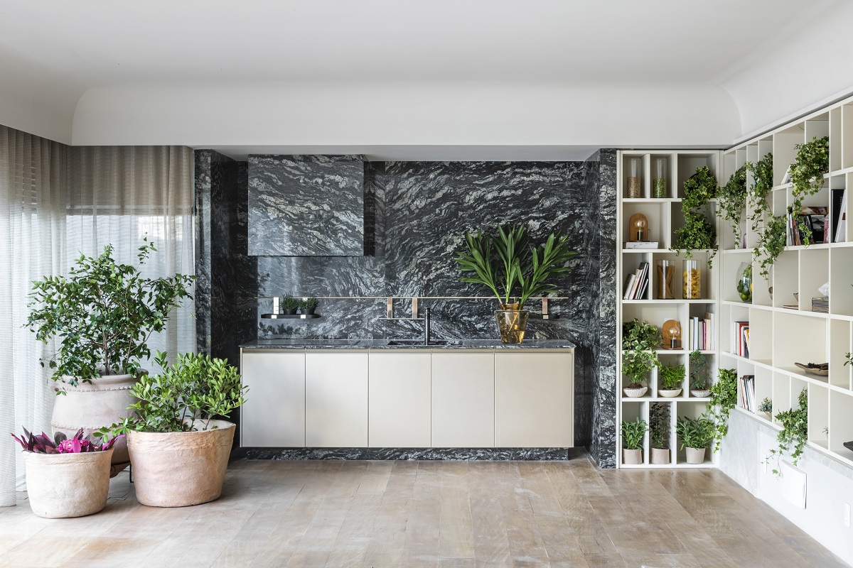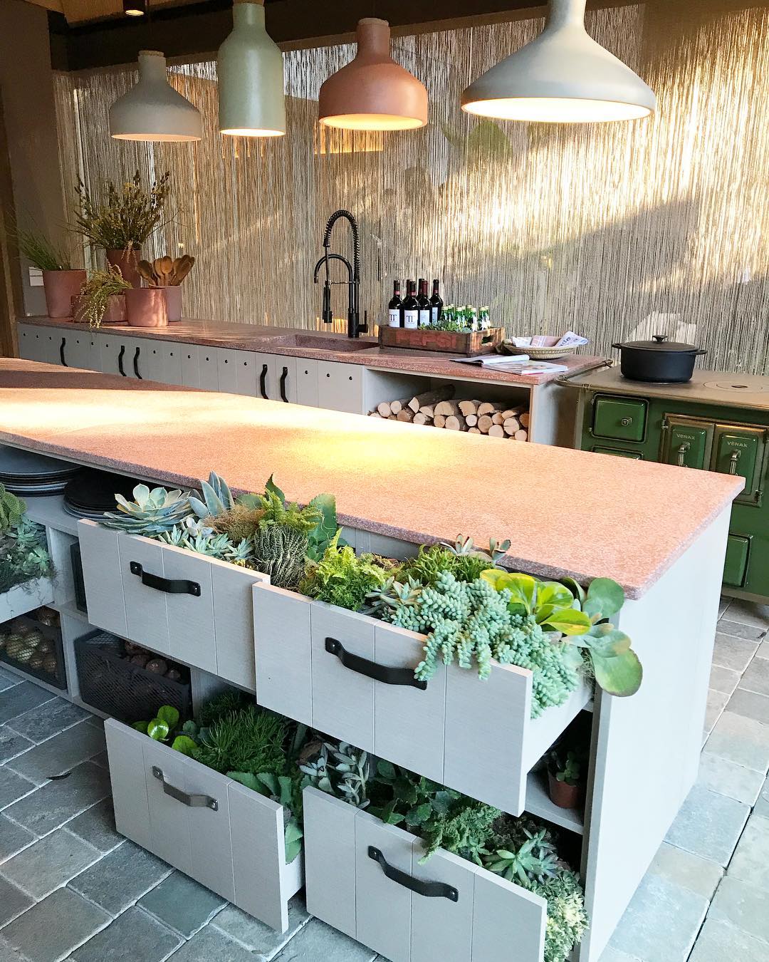 Nestes ambientes, as prateleiras funcionam como suporte para vasos e vão do banheiro à cozinha. Quanto mais vasos, mais clima de floresta. Tem até uma ideia de colocar as plantas dentro das gavetas do armário. Acho pouco prático para o dia a dia, mas muito interessante para uma ocasião especial.